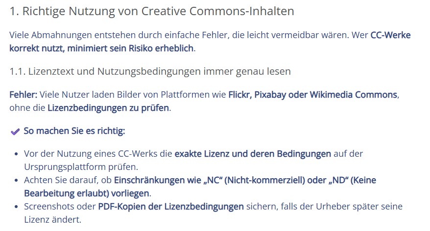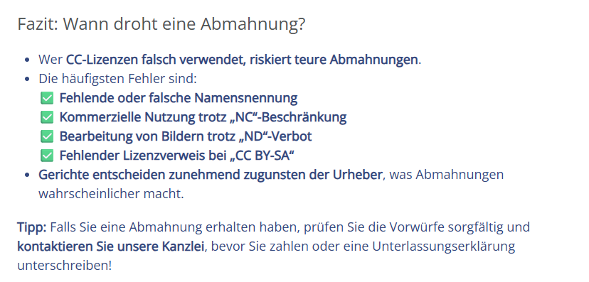 Es lohnt sich diese Seite mal genauer anzuschauen. Dort stehen auch Beispiele von Gerichtsurteilen drin. Zudem gibt es Tipps, wie man Creative-Commons-Inhalte richtig nutzt und es werden auch alternativen angeboten.